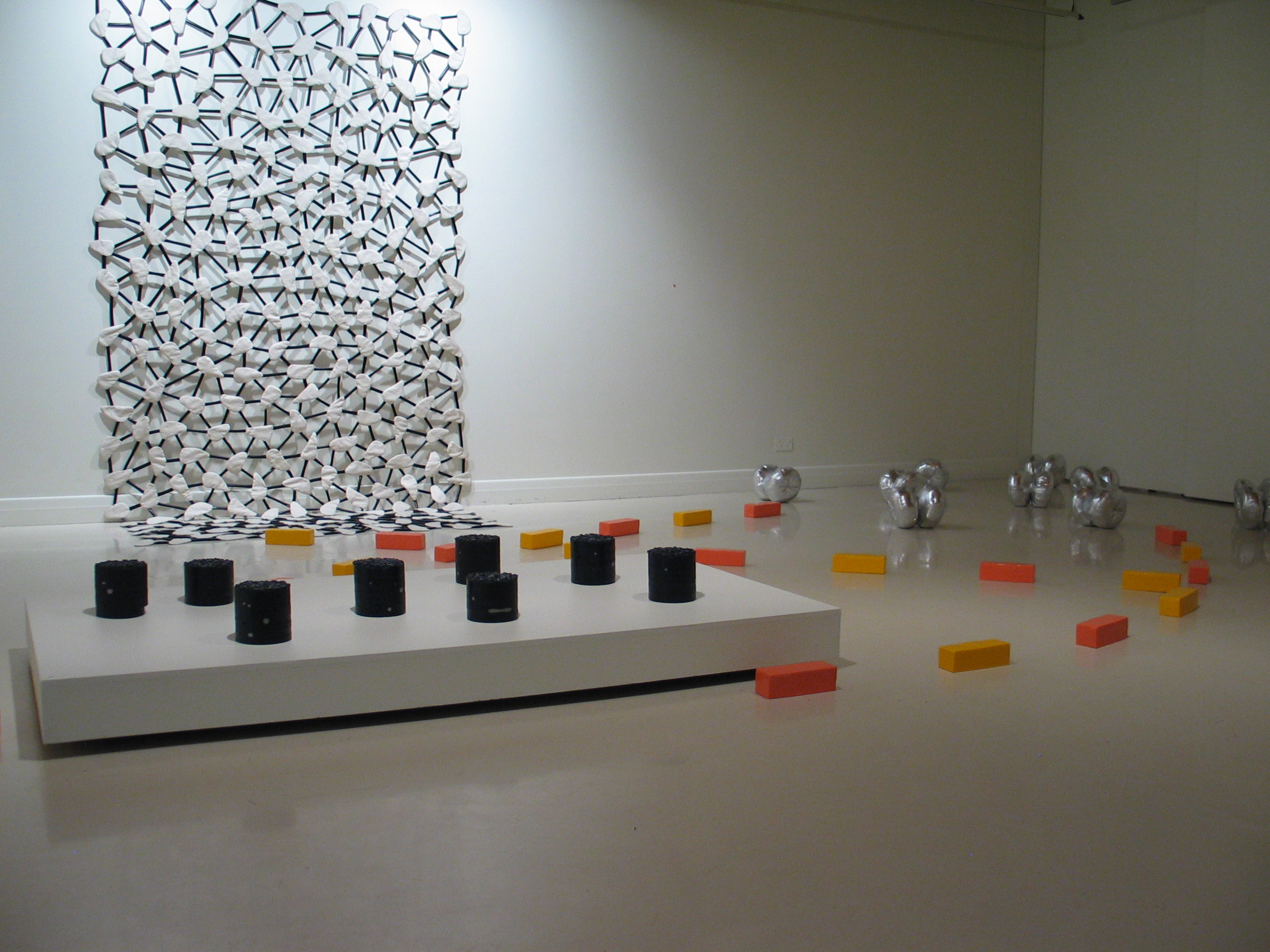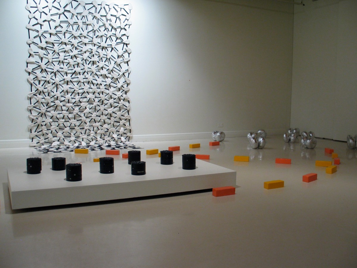 8 Spin, Sky Field, Line Drawing, These Points Concrete, polished steel, varnish, acrylic and glitter; cotton drill, synthetic fabric, wadding, thread; cast plaster and enamel paint; fabric, synthetic stuffing and thread